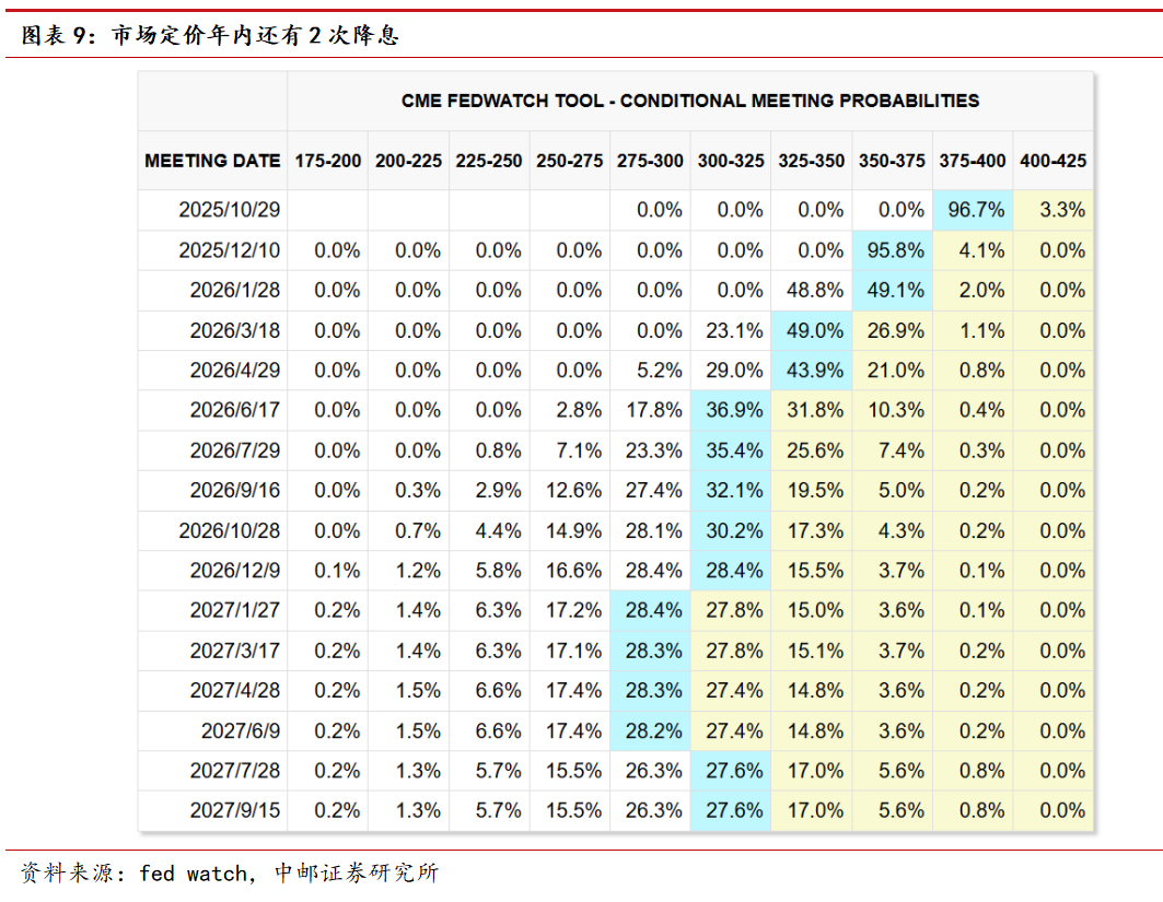 近期SOFR(担保隔夜融资利率)与IORB(银行在美联储的准备金利率)之间的利差转正且显著走阔,部分市场参与者据此认为,美联储在10月末就会停止缩表。然而在RRP余额耗尽后,IORB是SOFR的下限,美联储可以通过下调IORB的方式促使资金重新流向市场,从而缓解流动性压力,而不需要彻底停止缩表,2018年末即出现过类似操作。与18-19年“钱荒”时相比,当前各类银行的准备金均较为宽裕,仍然能够从一定程度上支撑美国资金市场。
