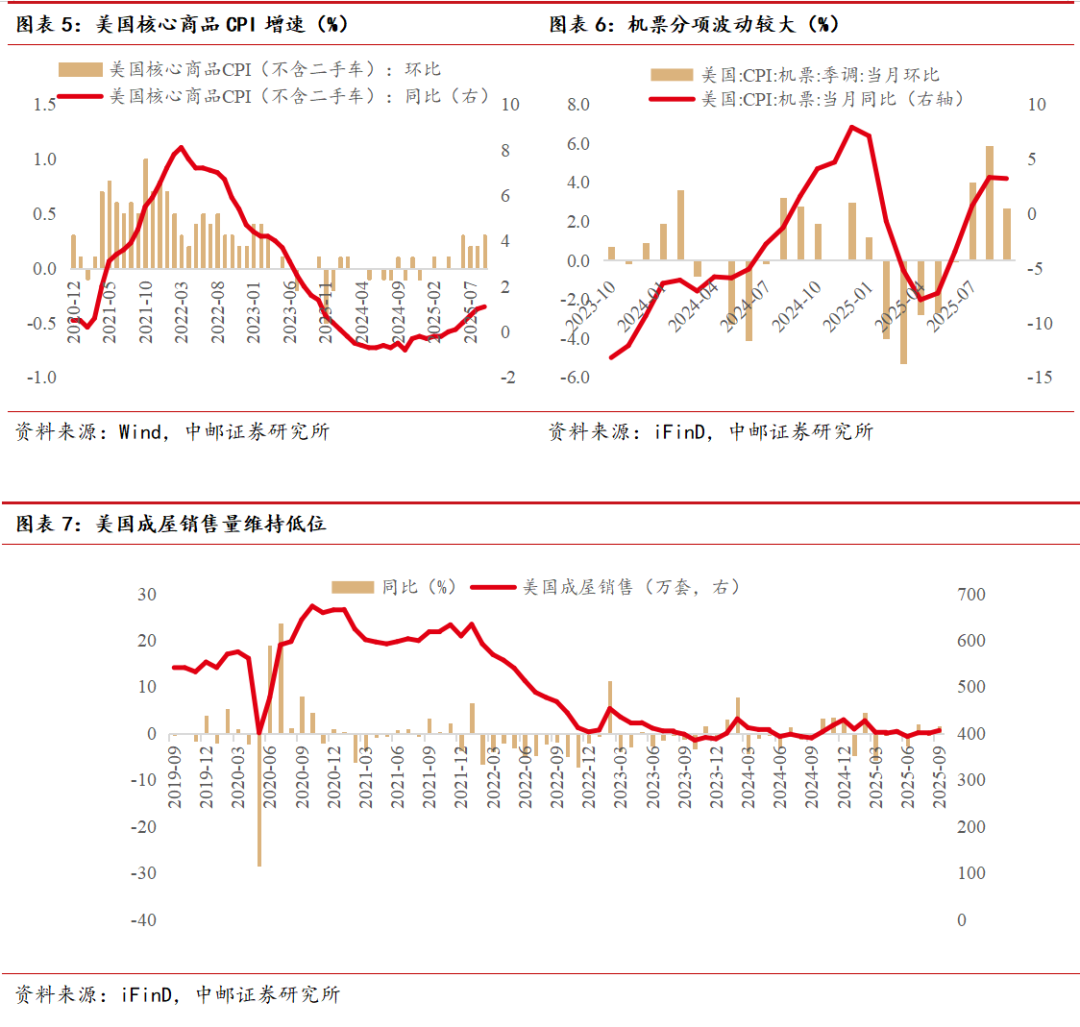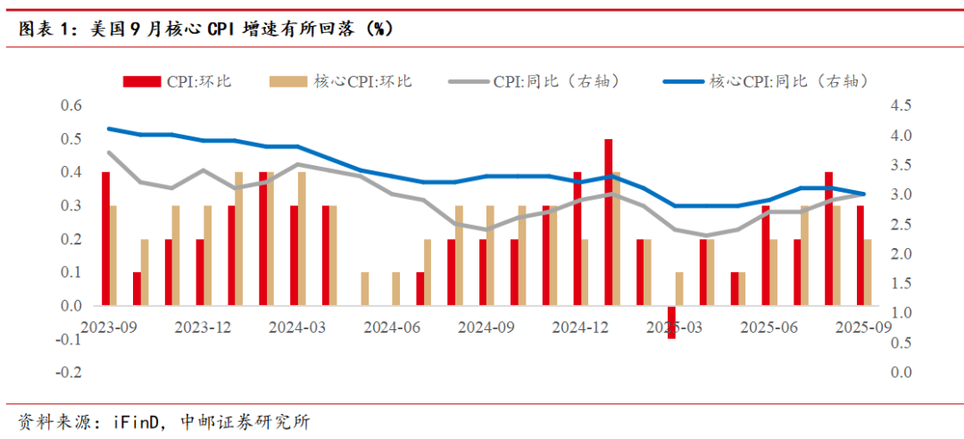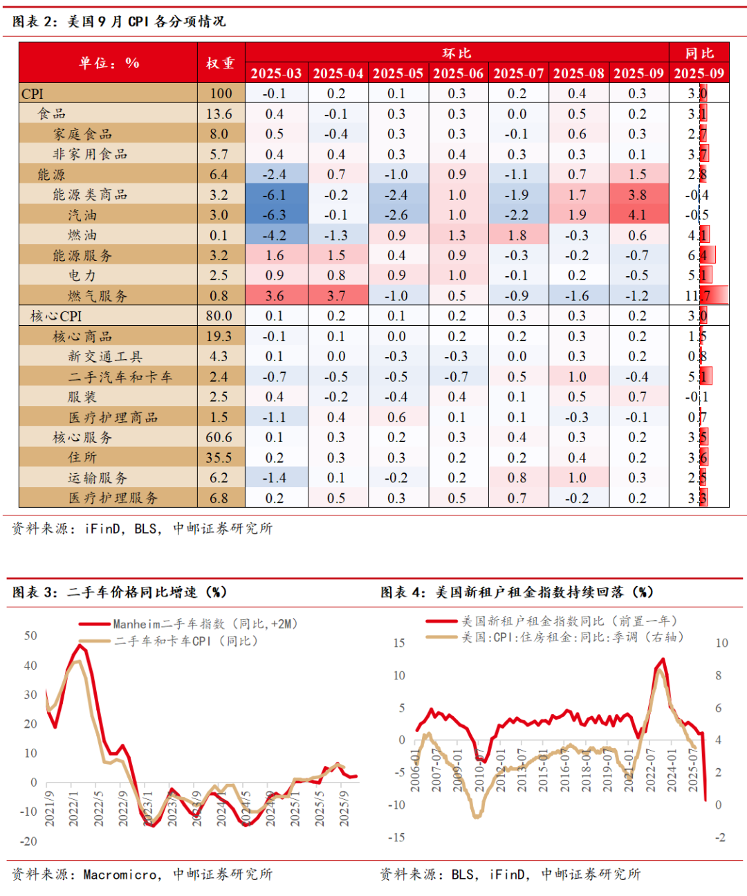 美国延迟发布的9月CPI数据显示,通胀压力继续缓和。从分项上看,核心商品通胀继续坚挺,但二手车价格有所回落;核心服务通胀降温,其中住房分项是主要推动力,并且从前瞻指标新租户租金来看,住房通胀的回落趋势仍将持续。不温不火的二手车价格和持续降温的住房通胀对冲了关税对核心商品价格的抬升,为本周美联储降息扫清了障碍。