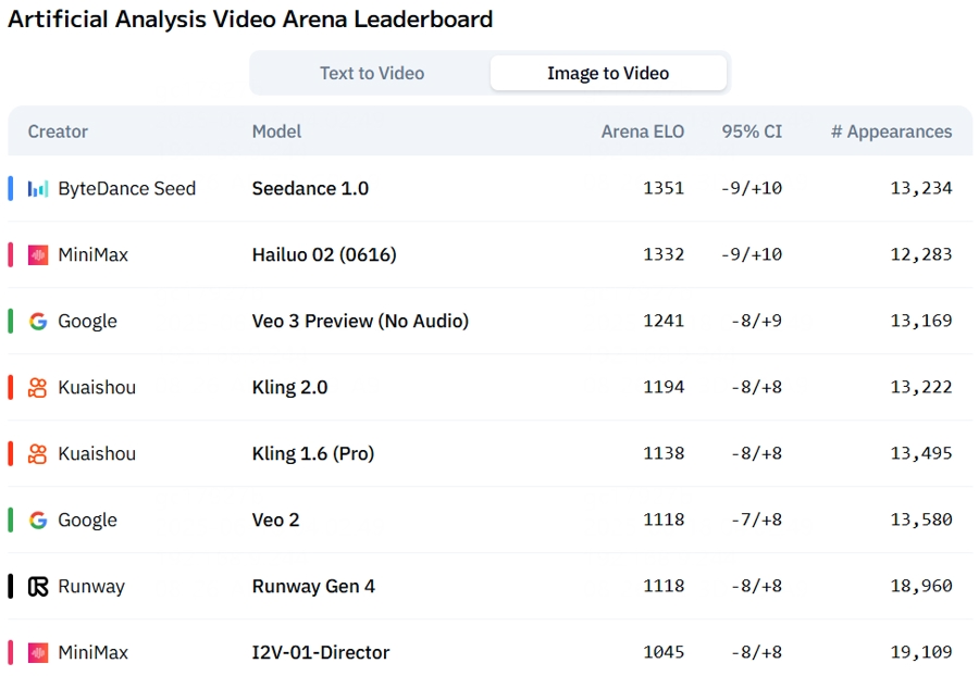 模型一经发布,就在国际权威测评榜单Artificial Analysis视频竞技场中迅速拿下第二名成绩,领先Google的Veo 3和快手的可灵(Kling)等一众强劲对手。