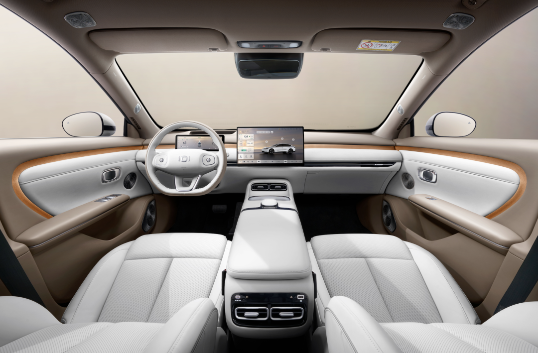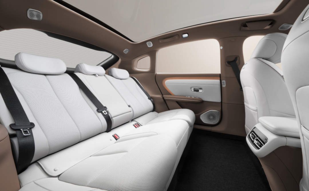 得益于中型车的尺寸,车内乘坐空间同样宽裕,后排地板中间无凸起,配备扶手箱和3个头枕。全车零压电动按摩/加热/通风座椅,后排座椅最大倾斜角度为145度,提供4.6升车载冷暖冰箱、67瓦USB Type-C充电接口、256色氛围灯、20扬声器NEVO Sound天枢源声音响系统等。尾部采用掀背式尾门设计,拿取行李方便。