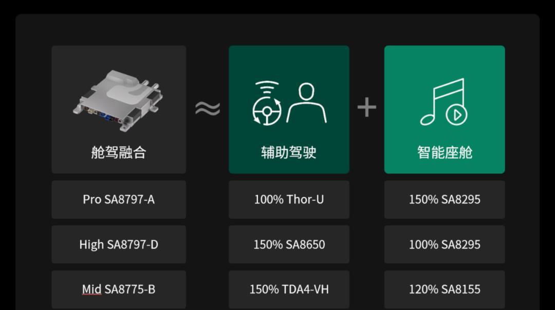 我首先想到的是关于座舱这边会不会有适配问题和算力的牵制。高通在对骁龙 8775 研发阶段就向双域融合的方向进行了整合,而且目前汽车座舱平台中骁龙车载系列处理器几乎是唯一解,所以相比之前英伟达提出的基于 Thor 的集中域控,骁龙平台的普及度不会给这个方案带来特别大的前期适配工程量。另外卓驭目前虽然并没有打算跨行去做智能座舱系统,而是选择半开放合作生态的方式,在研发阶段和合作伙伴联调智能座舱的部分。比如在车机屏幕和仪表的交互界面和应用层,可以由其它合作伙伴来定义。并且可以在前期研发阶段在底层调整平台算力的分配比例,比如在座舱有多屏需求时就可以多分配算力给座舱部分,来根据整车定义来调配座舱和智驾功能的权衡。
