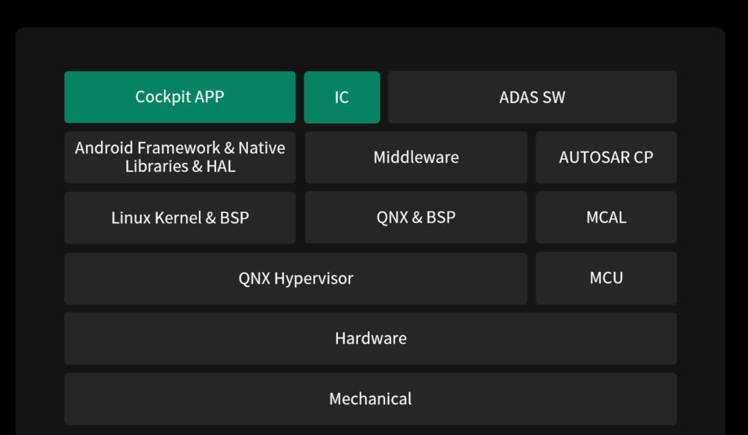 就拿很多现有车型来说,单就一个座舱的系统,它的系统结构设计也并不是单一的。比如很多车看起来都运行着高度定制的安卓系统,但实际上为了确保安全性,整个座舱的系统设计也不是围绕着安卓单一系统运行的,在更底层也有着非常安全的 QNX 系统的配合,来确保即使上层的安卓系统崩溃,也不会在行驶过程中影响底层系统和行车安全。